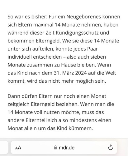 Das stimmt. Hoffentlich setzt die Regierung dann schnell die 10 Werktage Vaterschaftsurlaub um. Das wäre wenigstens etwas, es bleibt zu hoffen das es bis zum 1.4.24 der Fall ist... 🤷 Aktuell stellt sich die FDP dem noch in den wege... 🙄Immerhin würden diese 10 Arbeitstage dann voll bezahlt werden ...